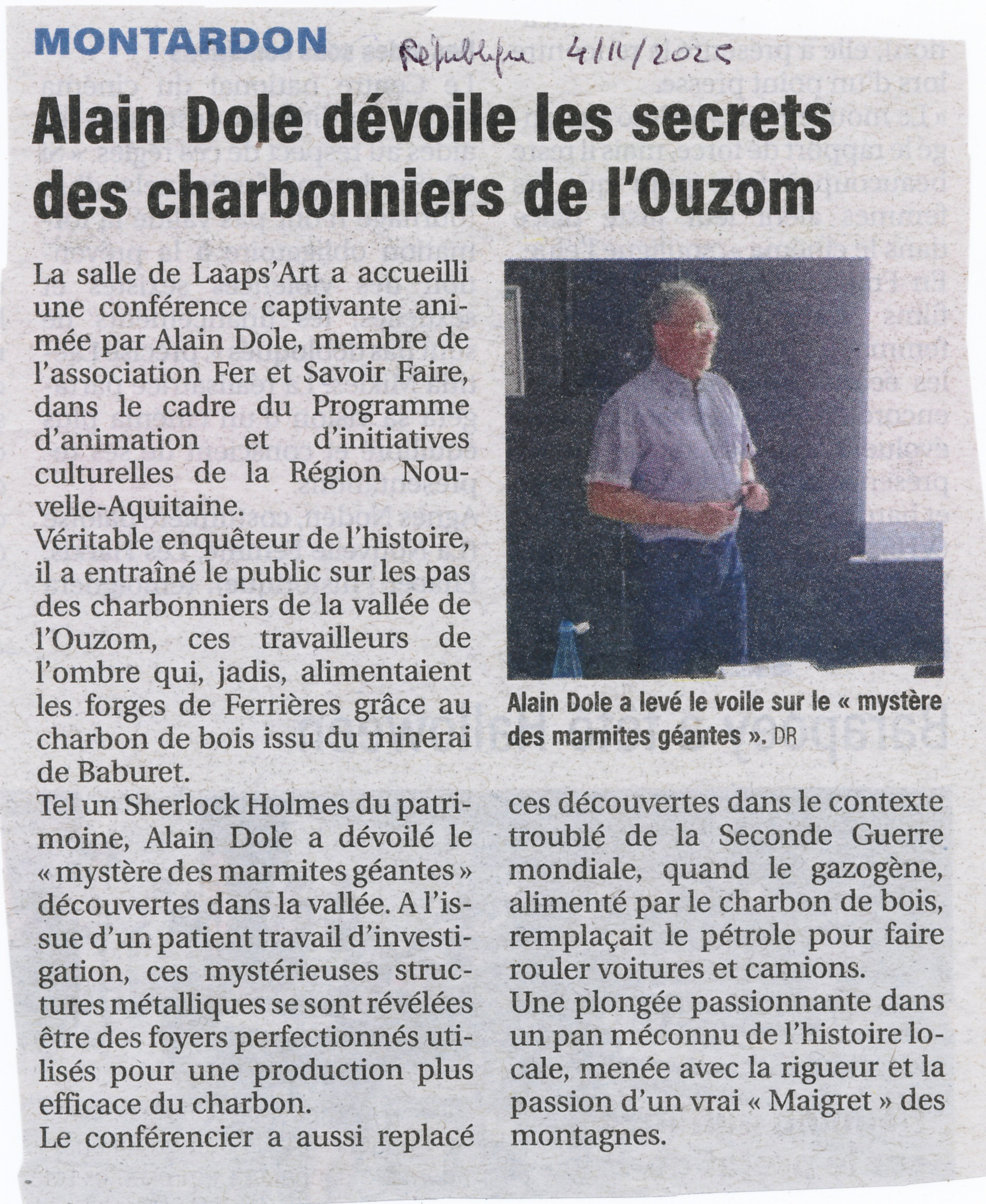 Si certains d'entre nous connaissaient les activités minières et métallurgiques de la vallée de l'Ouzoum, il était nécessaire d'apporter un éclairage sur le rôle fondamental des charbonniers qui apportaient un "feu" indispensable à la fabrication du Fer. Personnages méconnus à la vie très rude, ils ont laissé des vestiges en montagne qui ont été commentés dans les conférences organisées par FER et SAVOIR FAIRE. (Voir Documents associés)