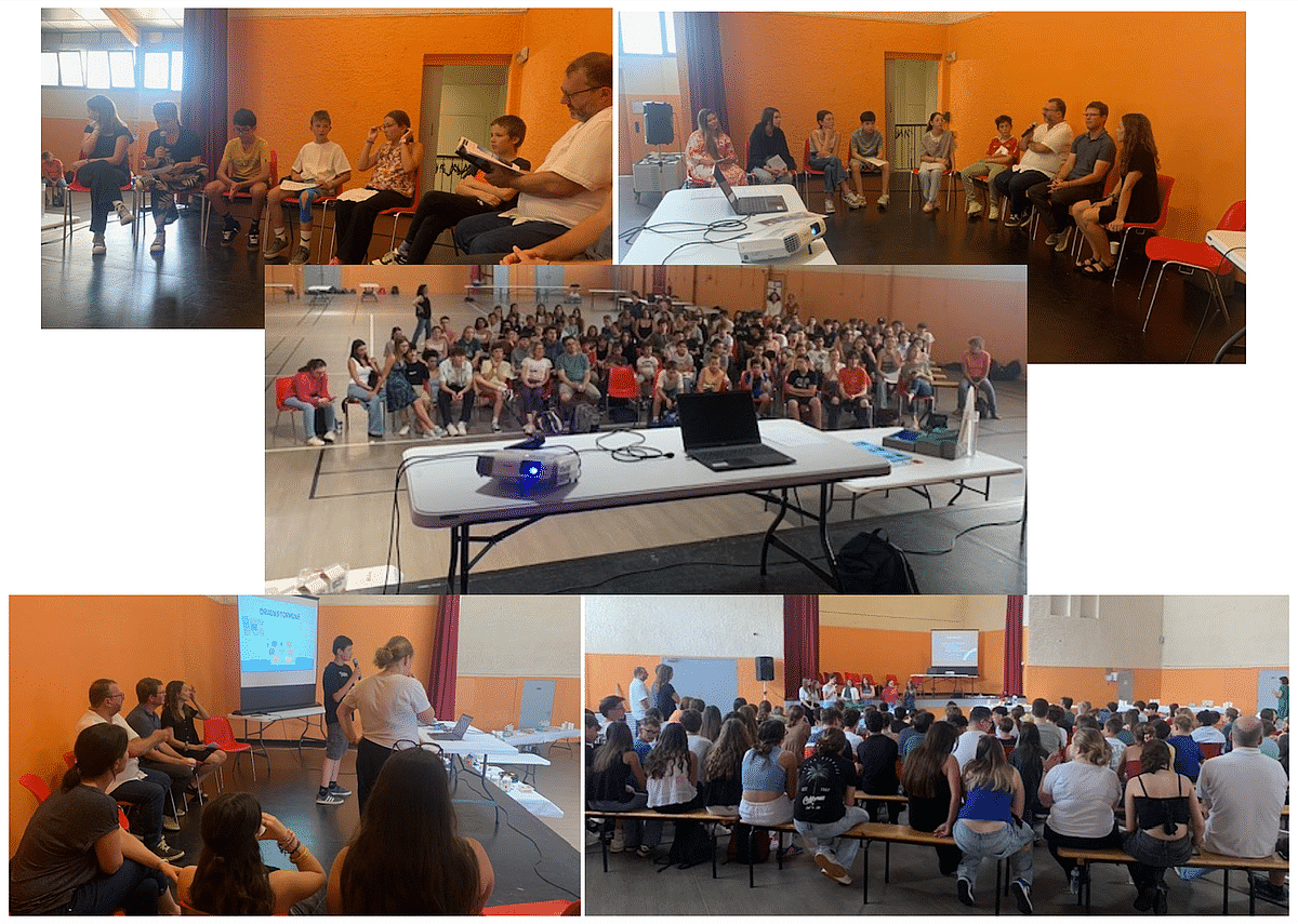 Après la matinée consacrée au passage sur les ateliers et une pause repas bien méritée, une table ronde a été organisée avec 3 experts : Lucie Schwartz et Fabien Gleyze, du SYDEC et Mathieu Sébilo. L'occasion pour les élèves de présenter leur projet et d'échanger avec les intervenants, défi relevé avec brio par les plus jeunes, quelque peu angoissés par cet "oral" !