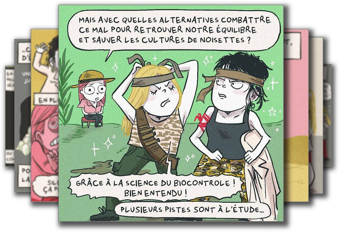 Pour cela, en collaboration avec la revue la Ébullition(s), un article de vulgarisation et une bande dessinée retraçant les recherches de nos deux scientifiques ont été réalisés. La dessinatrice Anne-Perrine Couët a illustré avec brio et avec humour l'état des recherches en biocontrôle de la noisette en accompagnant Julie et Sibylle dans une aventure cinématographique. Le choix narratif teinté d'humour permet de rendre leur travail accessible à tous, mais surtout offrir aux jeunes filles des modèles féminins identifiables dans un domaine où la présence des femmes reste parfois minorée. Ce type de représentation ne feront pas disparaître les stéréotypes, mais déposent de petites graines qui, avec le temps, peuvent les fissurer.