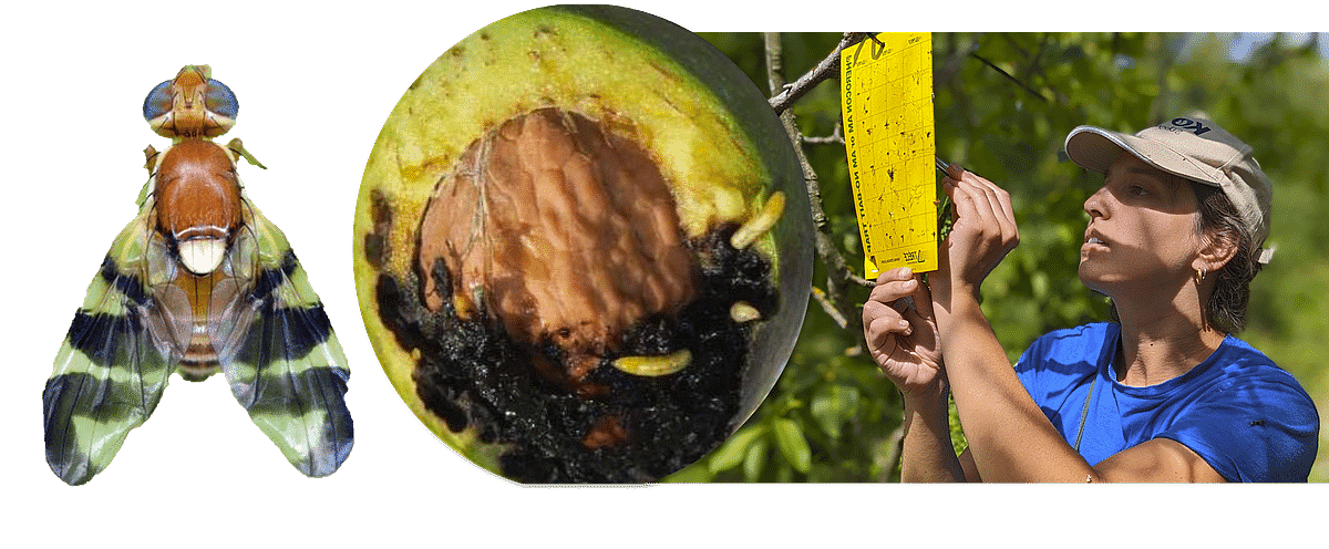 Figure. 4. Illustration d'une mouche du brou, à gauche, de ses dégâts par ses larves au centre, et enfin, les relevés réalisé par Sibylle Papillon sur des pièges chromatiques. Crédit photos: Klejdysz, Freydier et Hamidi.