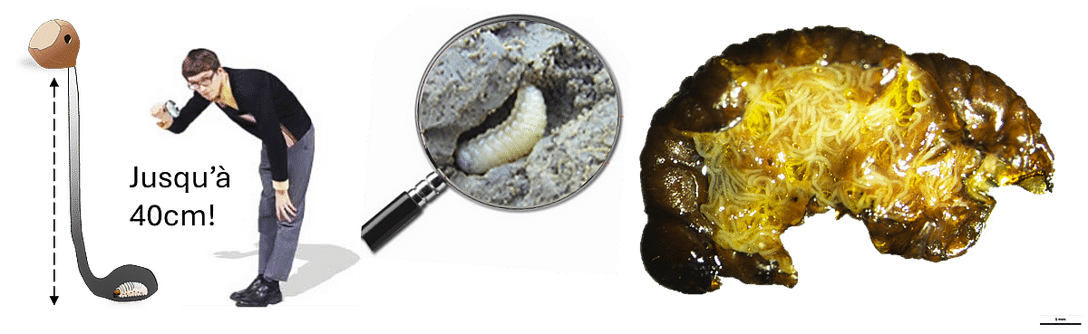 Figure 2. Illustration représentant une larve de balanin dans le sol, dans sa logette et à droite une larve contamination par les vers nématode. Crédits photos: Souchaud et Hamidi.