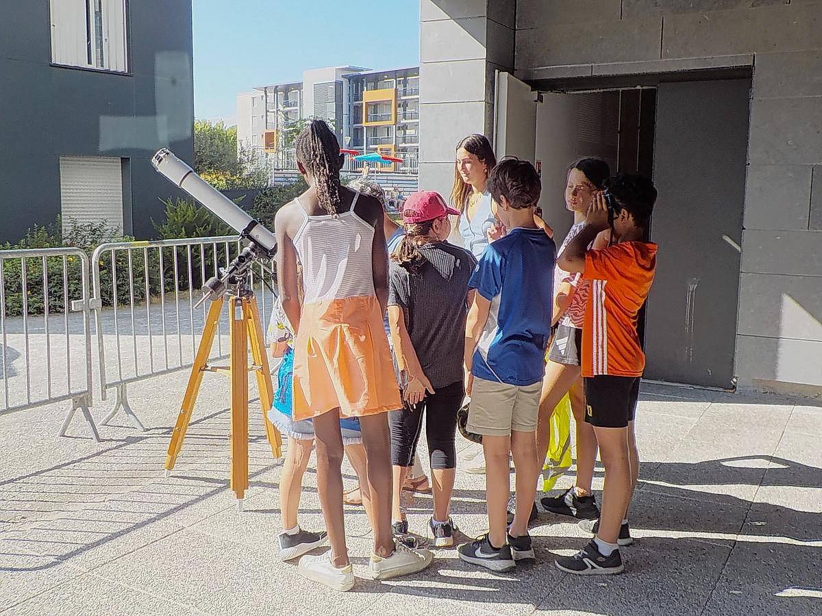 - Pour clôturer leur visite, ils ont pu mettre l’œil à l’oculaire d’une lunette astronomique pour admirer et compter les nombreuses taches solaires qui parsèment actuellement le disque du soleil.