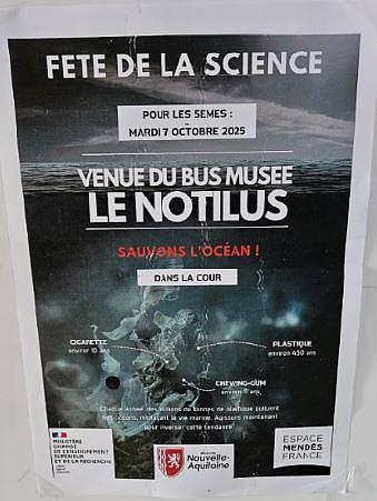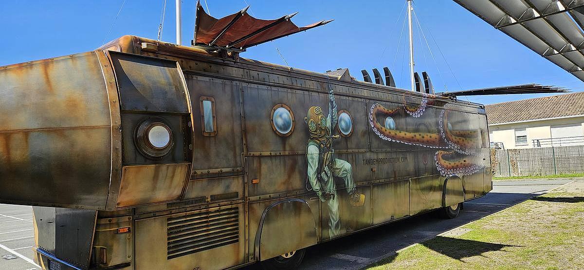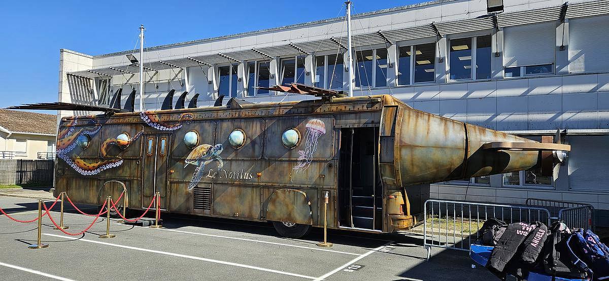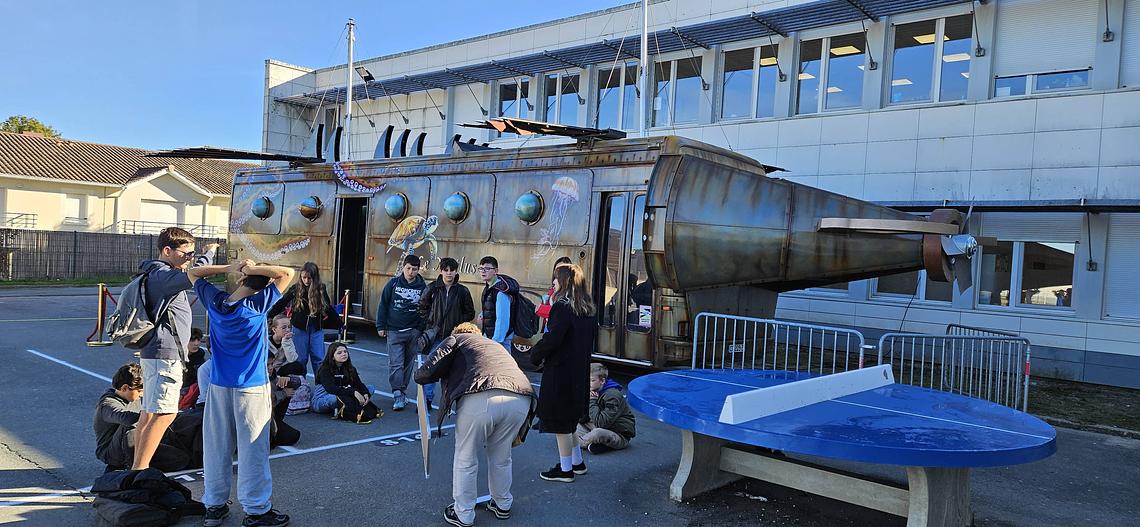 Mardi 7 Octobre 2025, l'équipe Tandem Prod a été accueillie une nouvelle fois au collège Samuel Dumenieu de Montendre (17130) pour présenter son bus-musée itinérant: le Notilus: Incroyable sous-marin terrestre destiné à sensibiliser à la protection des océans et labellisé par le Ministère de la Transition écologique, de la Biodiversité, de la Forêt, de la Mer et de la Pêche "La Mer en Commun - Année de la Mer"