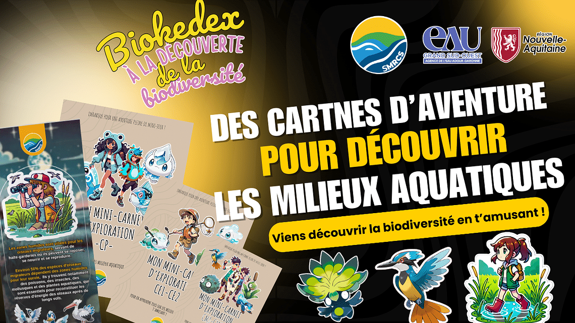 Dans le prolongement de l’univers pédagogique “Biokémon – À la découverte de la biodiversité”, le Syndicat Mixte de Rivières Côte Sud a développé une série de petits carnets de jeu d’aventure destinés à accompagner sa médiation scientifique auprès des élèves du territoire. Ces supports sont conçus pour favoriser la découverte des milieux aquatiques, de leur biodiversité et des zones humides, à travers une approche ludique, narrative et visuelle.