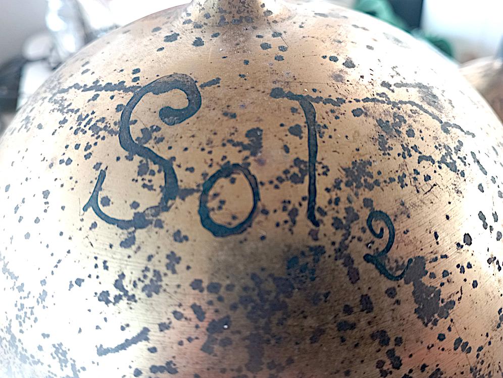 Il est inscrit à l’encre, sur la plus grosse bouteille « Sol 2 » et sur les deux plus petites « Mi 3 » et « Sol 3 ». Ces inscriptions ont certainement été apposées il y a plus d’un siècle, comme un moyen mémo-technique de se souvenir des notes émises lors d’un souffle dans ces sphères.