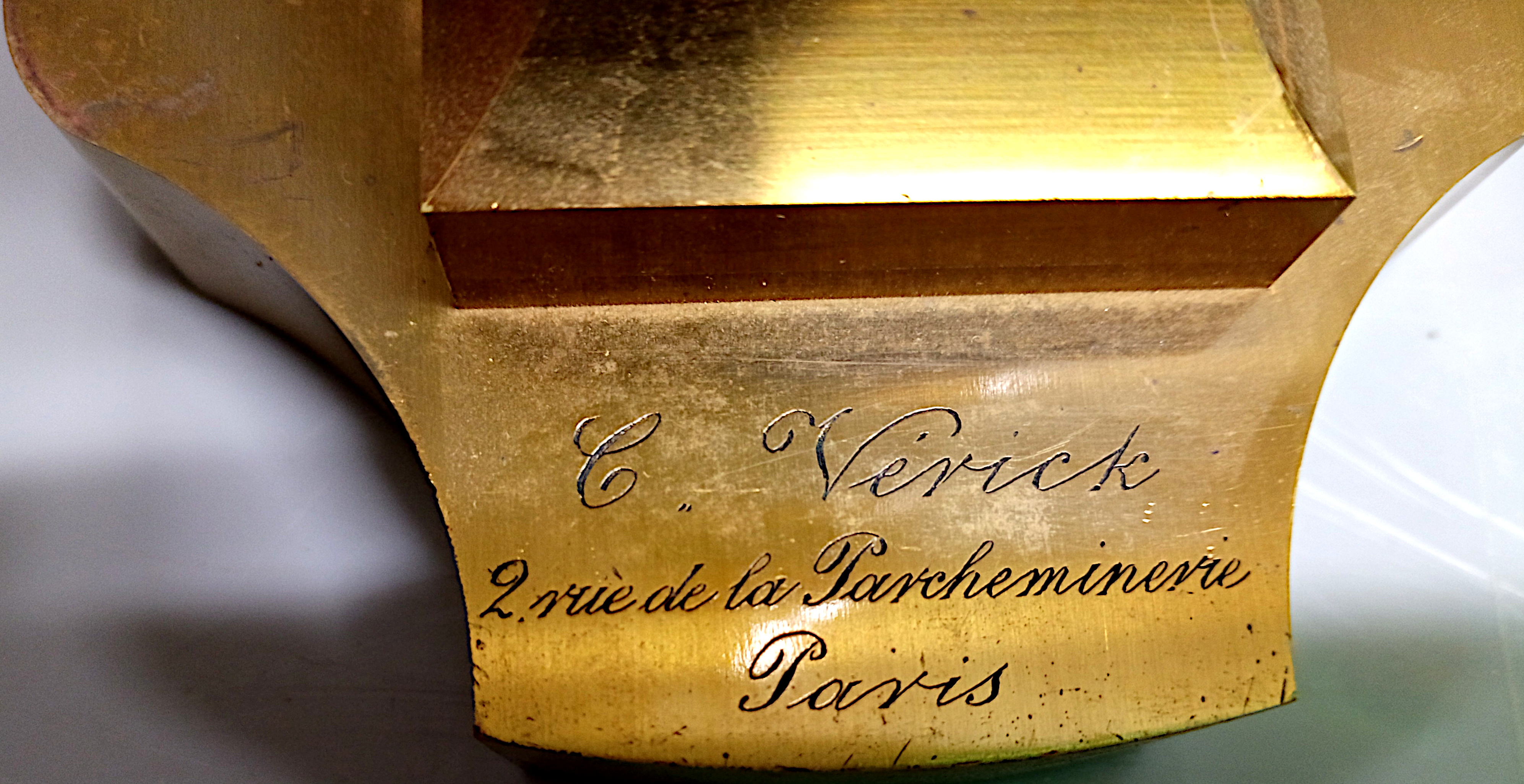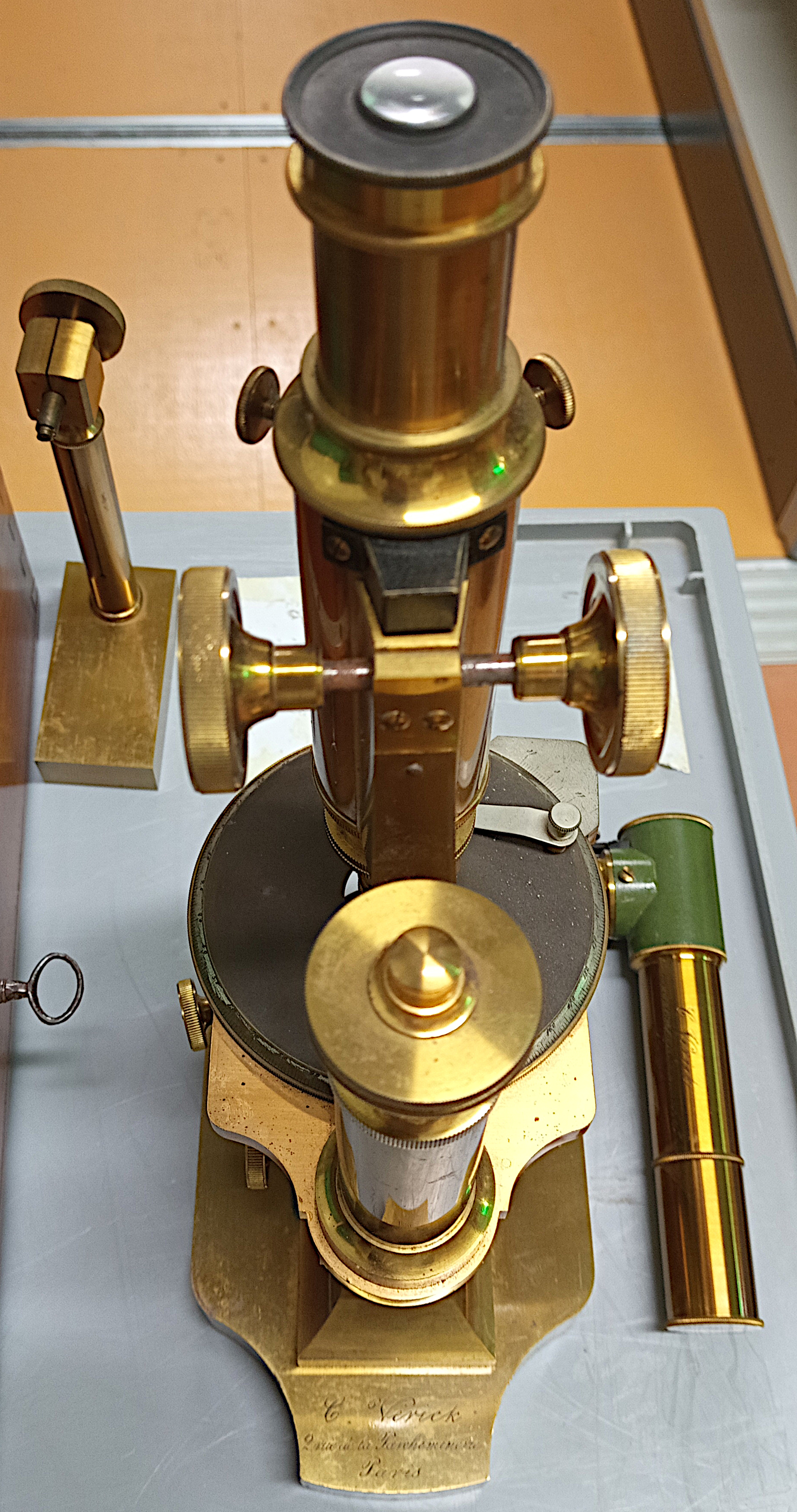 Les plus forts grossissements étaient obtenus en tirant le tube optique au maximum. Sur le pied de l’instrument est gravée la mention « C. Vérick 2 rue de la Parcheminerie Paris ». Le tube coudé pouvant être ajouté à l’ensemble révèle la même inscription.