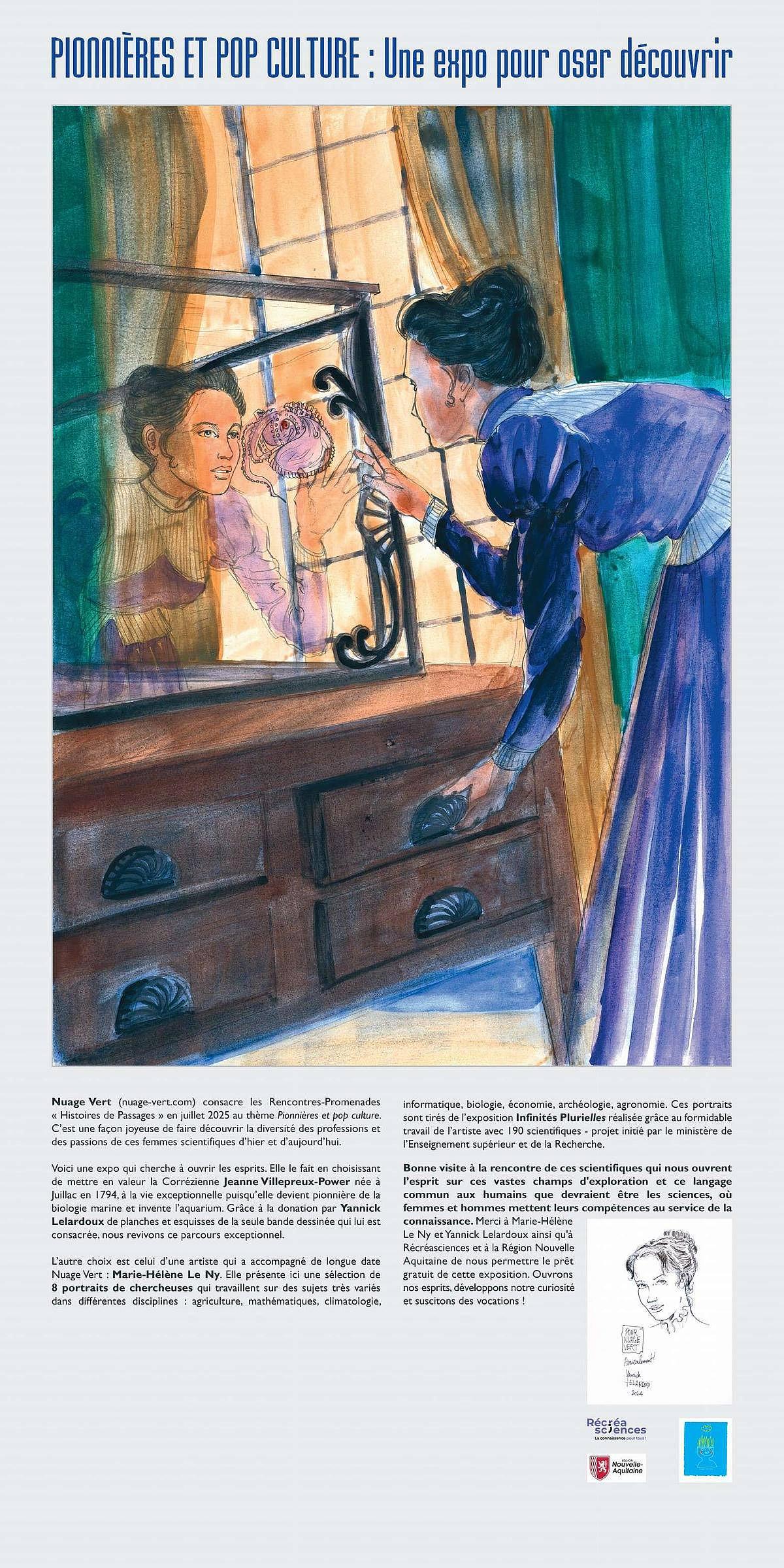 Elle part des planches de bandes dessinées de Yannick Lelardoux sur la Corrézienne Jeanne Villepreux-Power, pionnière mondiale de la biologie marine au XIXe siècle. L'artiste et photographe Marie-Hélène Le Ny complète cet aspect historique par des portraits de femmes scientifiques d'aujourd'hui dans des domaines très différents.