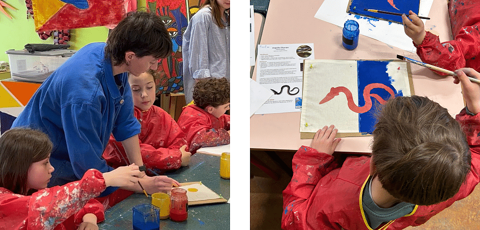 Le projet s’est déroulé en 3 séances, menées par Angéline Valentini. Lors de la première séance une espèce marine protégée à été associée à chaque élève, ils ont ainsi pu évoquer ensemble la richesse et la fragilité de la biodiversité marine. Angéline leur a expliqué ce que sont les pavillons, ces drapeaux hissés sur les bateaux pour communiquer entre eux en cas de panne électrique ou lors de célébrations. Chaque élève a pu faire le croquis de son espèce et a choisi le design de son pavillon. La deuxième séance leur a permis de découvrir le processus de fabrication de la peinture naturelle, réalisée à base de seulement 3 ingrédients : de l’eau, un liant et un pigment - ici un pigment issu de la feuille d’indigotier pour le bleu et des ocres pour le jaune et le rouge. À l’aide de ces trois couleurs, ils ont peint leur espèce avec un pochoir sur un tissu de récupération. Enfin, lors de la troisième et dernière séance, ils ont achevé leurs créations en peignant le fond de leur pavillon, créant ainsi des œuvres singulières.