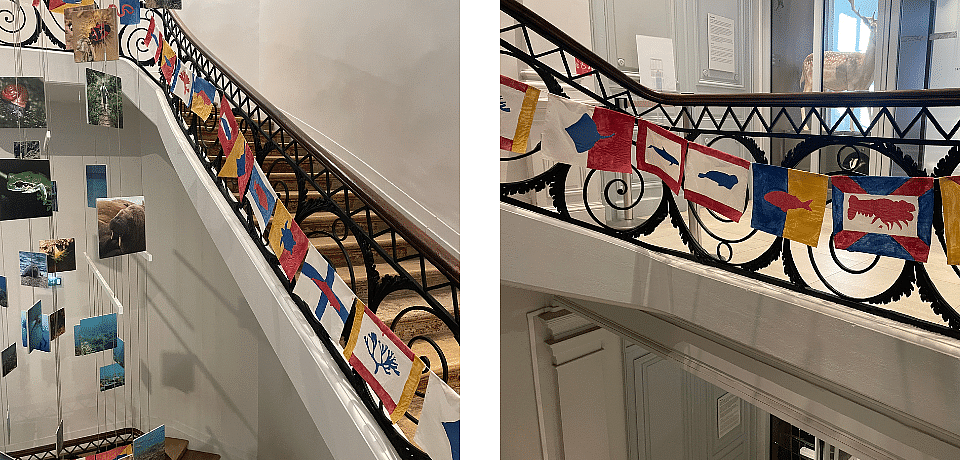 Les élèves de CE2, CM1 et CM2 ont exploré la diversité de la vie marine et sa préservation à travers la création d’un Grand Pavois, un ensemble de pavillons inspirés du code international des signaux maritimes. Chaque pavillon, peint par un élève à l’aide d’encres naturelles, représente une espèce marine, mettant en lumière la richesse des océans.