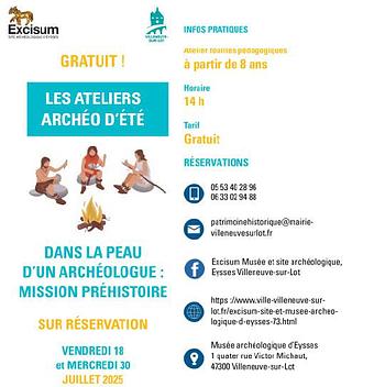 Pour les vacances d'été, le musée archéologique d'Eysses invite les enfants à partir de 8 ans et leurs familles à deux ateliers "Dans la peau d'un archéologue : Mission Préhistoire". Équipés d'une truelle et d'un pinceau, les enfants pourront fouiller comme de vrais archéologues et découvrir un site préhistorique.