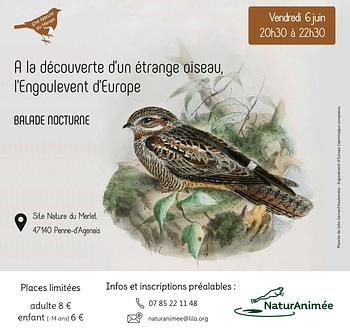 La balade nocturne est prévue le vendredi 6 juin de 20h30 à 22h30. Pour ceux qui ne connaissent pas cet oiseau, imaginez un mélange entre la morphologie du Martinet et le plumage d'une Chouette Hulotte ! Mais ce qui le rend particulier c'est avant tout son chant, un étrange ronronnement très puissant.