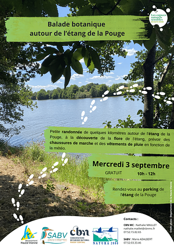 Au cœur du paysage bocager du Parc naturel régional Périgord Limousin, venez découvrir la flore de l'étang de la Pouge. Ce plan d'eau d'une trentaine d'hectares, protégé et figurant parmi le réseau de sites Natura 2000 et les Espaces naturels sensibles de Haute-Vienne, abrite une biodiversité remarquable. Guidés par une botaniste du CBN, vous aurez ainsi l'opportunité d'observer, au cours de cette balade gratuite, le patrimoine végétal de milieux humides diversifiés : herbiers aquatiques, petites mares, gazons amphibies, aulnaie-frênaie, prairies humides, mégaphorbiaies...