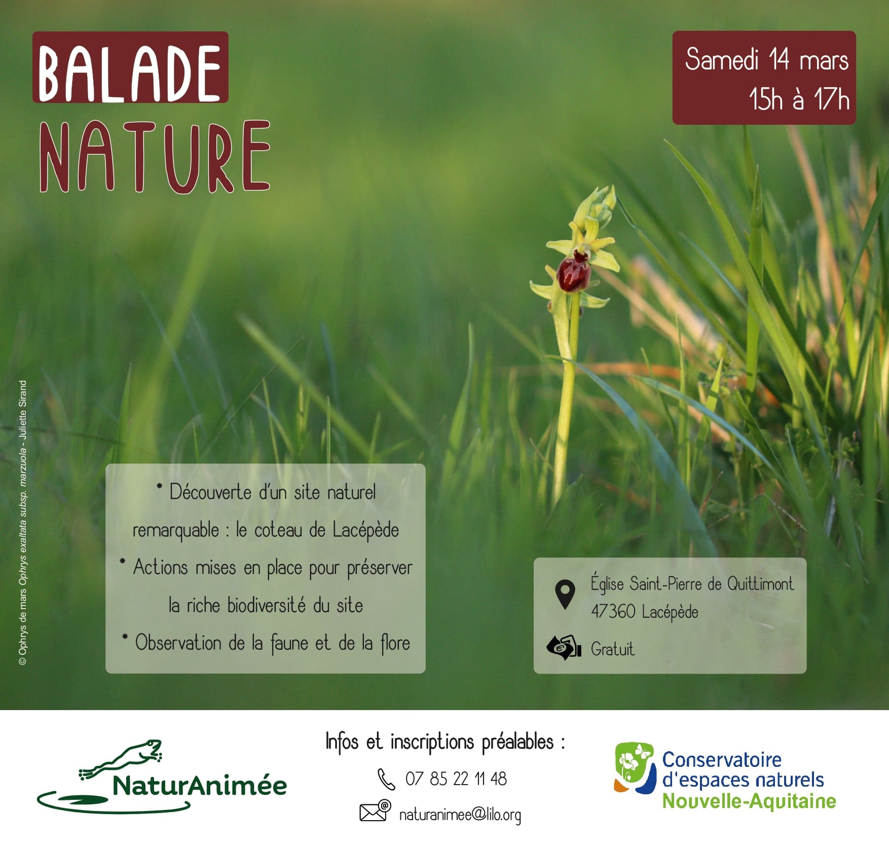 Le samedi 14 mars, petits et grands sont invités à célébrer l’arrivée du printemps lors d’une balade nature guidée sur le coteau de Lacépède, site préservé par le Conservatoire d’Espaces Naturels de Nouvelle-Aquitaine.