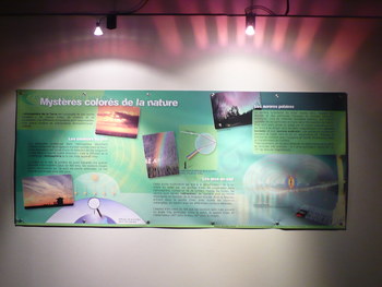La couleur est liée à la sensation que la lumière visible provoque sur notre œil, interprétée par notre cerveau. L'exposition "physique et couleurs" part de la compréhension de la lumière jusqu'à "la couleurs, vue d'ailleurs" en passant par les mystères colorés de la nature et l'interprétation des couleurs.