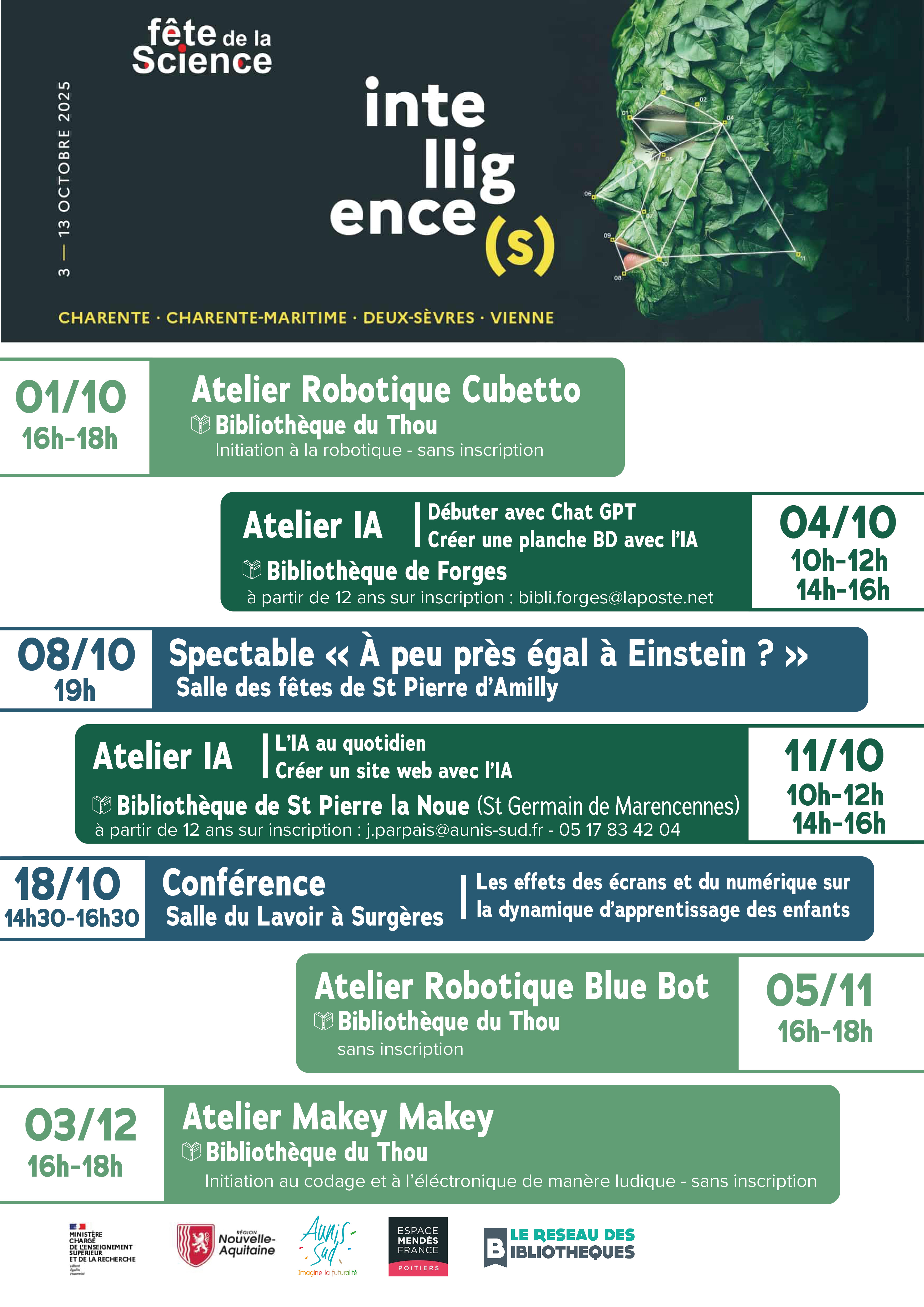 Dans le cadre de la Fête de la Science 2025 "Intelligence(s)", le Réseau des Bibliothèques Aunis Sud propose : des ateliers pour les plus jeunes autour de la robotique,