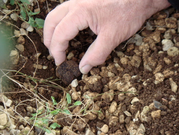 Avec ses terres de groies ou de champagne et son climat atlantique tempéré, l’ancienne région Poitou-Charentes, dans sa partie calcaire, bénéficie d’une situation pédoclimatique satisfaisante pour la culture de la truffe noire. Malgré cette configuration, elle a failli perdre son potentiel truffier au cours du XXe siècle, nous dit Jean-Marc Olivier, directeur de recherche honoraire à l’INRA Bordeaux et responsable de programme de recherches sur les truffes à l’INRA depuis 1984. Contrairement aux trufficulteurs d’autres régions historiquement truffières, les producteurs picto-charentais ne sont pas attachés à des techniques traditionnelles. Il y a donc une ouverture forte vers le suivi technique et un intérêt marqué pour les transferts de la recherche vers le terrain. Un effort collectif au cours des trente dernières années a permis de relancer une production qui occupe aujourd’hui environ 500 trufficulteurs professionnels et une bonne cohorte d’amateurs passionnés. On estime la commercialisation annuelle de la truffe noire entre 3 et 4 tonnes. La récolte est variable en fonction de la météorologie et des capacités d'arrosage. Elle dépend aussi des investissements en temps de travail dans les truffières : travail du sol, taille des arbres et bien sûr, l’apport de spores, une technique récente développée d’abord en Deux-Sèvres.