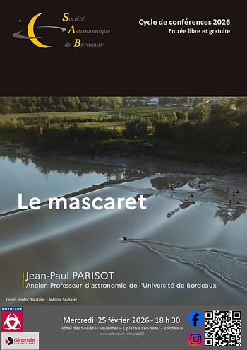 Cette conférence traite principalement des marées et du mascaret de la Garonne et de la Dordogne, mais on présentera aussi un panorama du mécanisme des marées et des grands mascarets du monde, du Brésil et de Chine. Seulement une centaine d'estuaires dans le monde possèdent un mascaret, dont deux en France, en Normandie et en Gironde. C’est un phénomène fortement médiatisé, mais très mal connu en raison du peu d’études les concernant. Il se présente sous la forme d’un ensemble de vagues qui peuvent atteindre 2m de hauteur, et se forme à l’instant de la basse mer. Si sa vitesse peut atteindre 20 km/h c’est bien la forme de l’estuaire qui favorise son développement. En effet, l’embouchure de la Gironde, en entonnoir et la faible profondeur permettent permettent ce développement à 140 km de l’embouchure. Sur la Garonne, le site de Podensac est particulièrement intéressant, car c’est là que les marées sont les plus importantes, et donc le mascaret le plus spectaculaire. Depuis plusieurs années, des mesures ont été effectuées en Garonne par le Laboratoire Océanographique de l’université de Bordeaux et les résultats très originaux obtenus durant ces campagnes de mesures seront la trame principale de cette conférence.