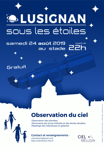Le samedi 24 août 2019 à partir de 22h au stade de Lusignan, une observation du ciel proposée par Ciel mélusin et ouverte à tous.
