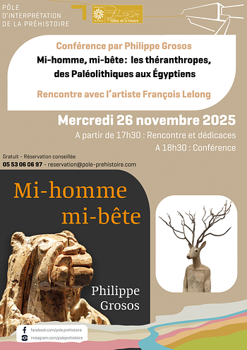 À partir de 17h30, une séance de vente-dédicace de l’ouvrage de Philippe Grosos sera proposée : Petite phénoménologie des théranthropes, des Paléolithiques aux Égyptiens (Cerf, 2025).