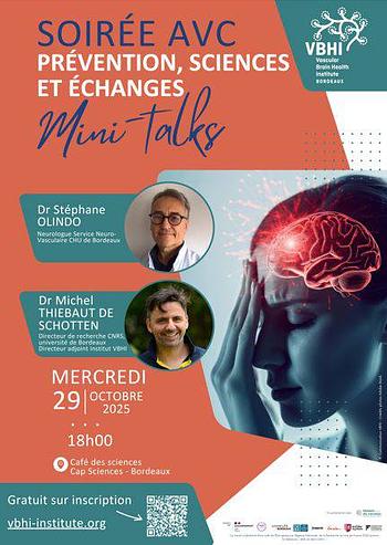 📆 Ce mercredi 29 octobre, l’institut VBHI (Vascular brain health Institute) vous invite à une soirée d’échanges à Cap Sciences, autour de la santé cérébrale sur le thème des AVC.