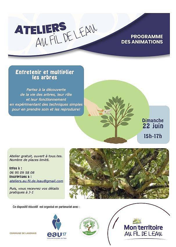 Le  prochain Ateliers au fil de l'eau,  "Entretenir et multiplier les arbres, animé par TERDEV, en partenariat avec Eau17, aura lieu le dimanche 22 juin de 15h à 17h à Landrais.