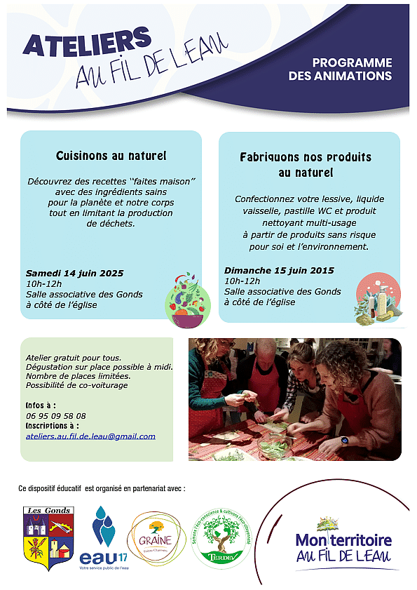 Les 2  prochains Ateliers au fil de l'eau,  animés par TERDEV, en partenariat avec Eau17, auront  lieu le dans la salle associative des Gonds :