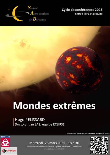 Le mercredi 26 mars 2025 à l'hôtel des sociétés savantes, 1 place Bardineau à Bordeaux, aura lieu une conférence en entrée libre sans réservation, ayant pour thème :"Mondes extrêmes"