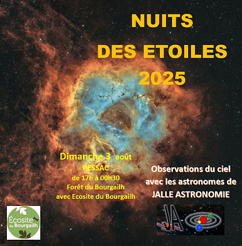 Pour fêter l’été et les étoiles, JALLE ASTRONOMIE vous donne rendez-vous sur 3 sites girondins pour ses NUITS DES ETOILES 2025, manifestation nationale proposée par l’AFA (Association Française d’Astronomie):