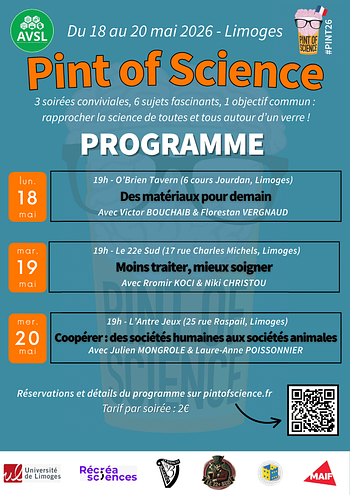 Retrouvez plus d’informations et réservez vos places (nombre limité) sur le site de Pint Of Science : https://pintofscience.fr/events/limoges.