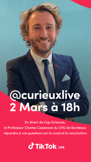 En partenariat avec TIK TOK France et le CHU de BORDEAUX, CURIEUX ! organise, en direct de Cap Sciences, un live national sur la plateforme, pour permettre aux utilisateurs de poser leurs questions en direct au Professeur Charles Cazanave, infectiologue au CHU de Bordeaux. Ce live sera animé par Alexandre MARSAT, rédacteur en chef de Curieux !