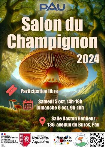 La Société Mycologique du Béarn (SMB) organise son traditionnel Salon du Champignon à Pau les 6 et 7 Octobre. Cet évènement gratuit s'adresse à tous les passionnés de Nature désireux d'en savoir plus sur les champignons : leur écologie, leur relation avec les végétaux, leur diversité, leur utilité, comment les reconnaitre, leur comestibilité ou toxicité ... Le Salon s'articule autour d'une exposition de près de 300 espèces de champignons fraîchement cueillis et de stands thématiques.  Les membres de l'association sont entièrement mobilisés pour l'occasion et prêts à échanger leurs connaissances avec tout public.