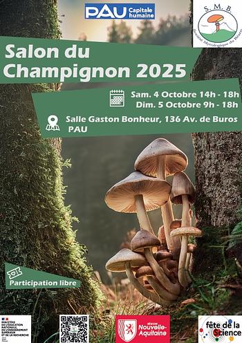 La Société Mycologique du Béarn (SMB) organise son traditionnel Salon du Champignon à Pau les 4 et 5 Octobre. Cet évènement gratuit s'adresse à tous les passionnés de Nature désireux d'en savoir plus sur les champignons : leur écologie, leur relation avec les végétaux, leur diversité, leur utilité, comment les reconnaitre, leur comestibilité ou toxicité ... Le Salon s'articule autour d'une exposition de près de 300 espèces de champignons fraîchement cueillis, de stands thématiques et éventuellement de conférences. Les membres de l'association sont entièrement mobilisés pour l'occasion et prêts à échanger leurs connaissances avec tout public.