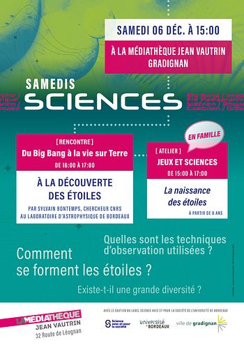 À partir de 8 ans - de 16h à 17h : rencontrez Sylvain Bontemps, chercheur CNRS au Laboratoire d'Astrophysique de Bordeaux (LAB), qui racontera la formation et la vie des étoiles et les recherches à ce sujet.