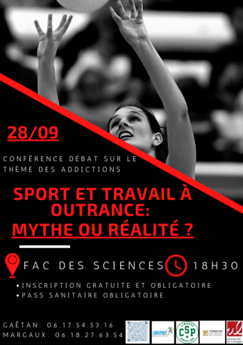 Cette conférence, organisée par des étudiants en Licence « Management du Sport » à la Faculté des Sciences et Techniques portera sur la dépendance à la pratique du sport (connue sous le nom de bigorexie) et au travail (le présentéisme).